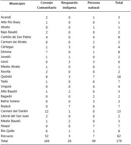 En las Tablas 2 y 3 se establece el total de autorizaciones de aprovechamiento forestal otorgadas a los consejos comunitarios, resguardos indígenas y personas naturales, además se determina cuáles son los municipios con mayor número de autorizaciones. De igual forma, se puede observar que el mayor número de autorizaciones corresponde a los consejos comunitarios, seguido de las personas naturales y en el último lugar a los resguardos indígenas.