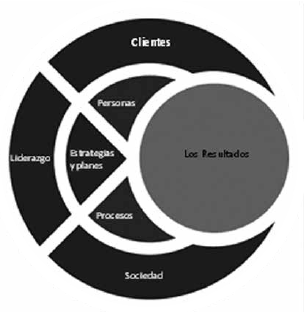 De tal forma, estos conceptos fundamentales se expresan en atributos medibles cuantitativa o cualitativamente, a través de acciones gerenciales propuestas en forma de cuestiones, que solicitan complementos importantes sobre 8 criterios de excelencia: liderazgo, estrategia y planes, clientes, sociedad, informaciones y conocimiento, personas, procesos y resultados, que están dispuestos en la Figura 2.