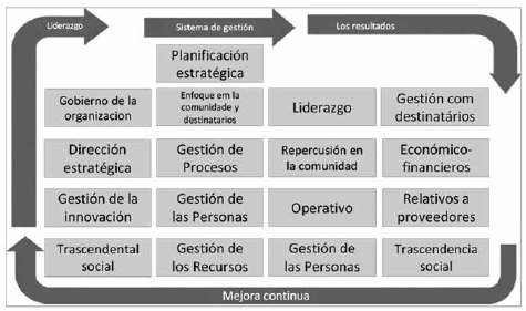 La documentación del modelo presenta dos versiones, estando una dirigida a empresas y otra específica para organizaciones sin fines de lucro, objeto de estudio del presente artículo, conforme a la Figura 3. Los supuestos de dicho modelo son que la gestión de desempeño debe basarse en la medición sistemática de los resultados y que la gestión de los procesos es parte fundamental para la mejora continua de las organizaciones públicas.