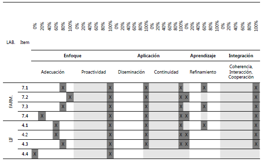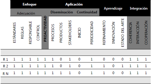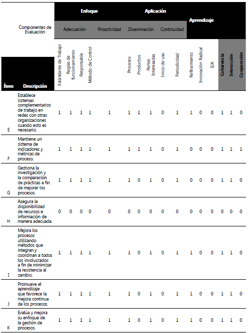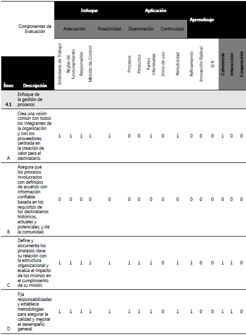 Para realizar el análisis comparativo se aplicaron dos instrumentos: a) una matriz de identificación de las prácticas de gestión, que figura en la Tabla 2, y b) una escala de evaluación del conjunto de prácticas, que se presenta en la Tabla 3. Para cada requisito (R1, R2, RN) se evaluaron cuatro factores: enfoque, aplicación, aprendizaje e integración. Estos factores están delineados en color negro en la Tabla 2. Los factores están compuestos por subfactores, que están en color gris, y estos a su vez están compuestos por atributos que están en color blanco. Cuando se observó en los relatos de las entrevistas y en los registros de los informes de gestión la presencia de los atributos, subfactores y factores, el requisito fue identificado con "1", y cuando se observó la ausencia de los mismos, el requisito fue identificado con "0".