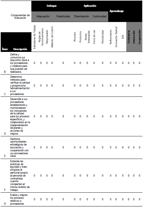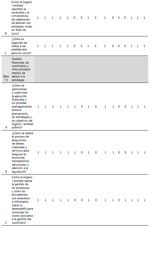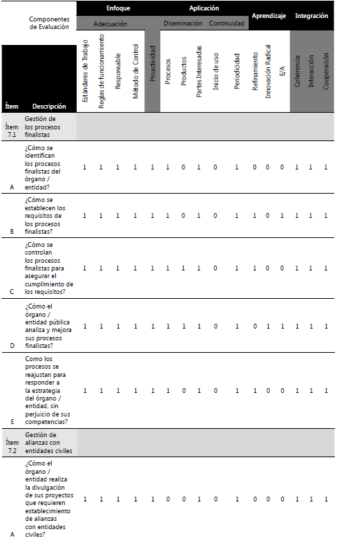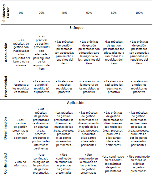 Cuanto mayor es la madurez de aplicación del modelo de gestión, mayor es el porcentaje alcanzado por la organización en la Tabla 3. El conjunto de prácticas de gestión referentes a los requisitos de cada modelo es evaluado considerando cada factor (enfoque, aplicación, aprendizaje e integración). El porcentaje de puntuación del ítem es determinado por el subfactor de menor valoración, más 10 puntos porcentuales, si al menos otros dos factores están en etapa superior. Para ponderar la cantidad de requisitos atendidos por las prácticas organizacionales, se presenta la siguiente escala de equivalencia de la escala: "Muchos" (= o> 1/4), "Mayoría" (= o> 1/2), "Casi todas" (= o> 3/4) y "Todas" (1/1). Cuando un requisito no presenta enfoque se debe aplicar "cero" para los demás factores (aplicación, aprendizaje e integración).