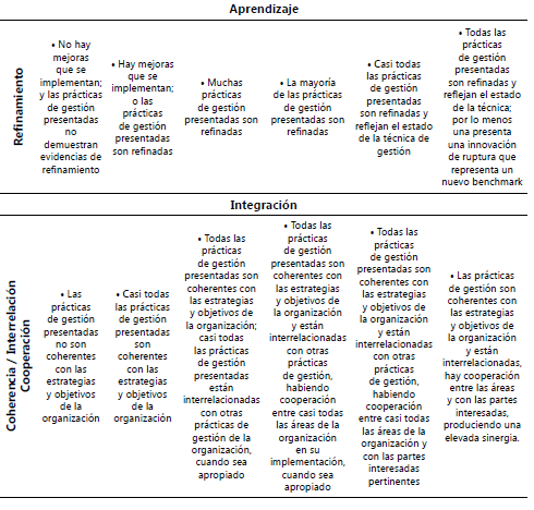 El factor aprendizaje se refiere al grado en que las prácticas de gestión de la organización presentan mejoras derivadas del proceso de mejoras, lo que puede incluir eventuales innovaciones, tanto incrementales como de ruptura. El factor integración se refiere a si el conjunto de prácticas presenta relación con las estrategias y objetivos de la organización, si su implementación ocurre de modo complementario con otras prácticas de gestión de la organización o si hay colaboración entre áreas de la organización y con sus partes interesadas, cuando sea pertinente.