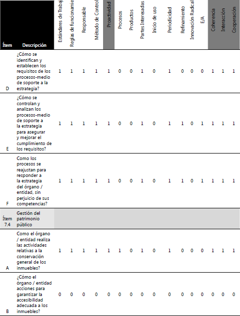 En cuanto al criterio 7, que trata de la gestión de desempeño a través de la gestión de procesos, y que es el objeto de comparación de este artículo, el modelo del Gespública lo divide en cuatro tópicos principales: Gestión de los Procesos Finalísticos (finalistas), con asignación de 40 puntos y con cinco ítems de análisis; Gestión de Alianzas con Entidades Civiles, con asignación de 15 puntos y con tres ítems; Gestión Financiera, de Suministros y de otros Procesos medio de Soporte a la Estrategia, con 50 puntos y con seis ítems, y por último, Gestión del patrimonio público, con asignación de 15 puntos y con seis ítems.