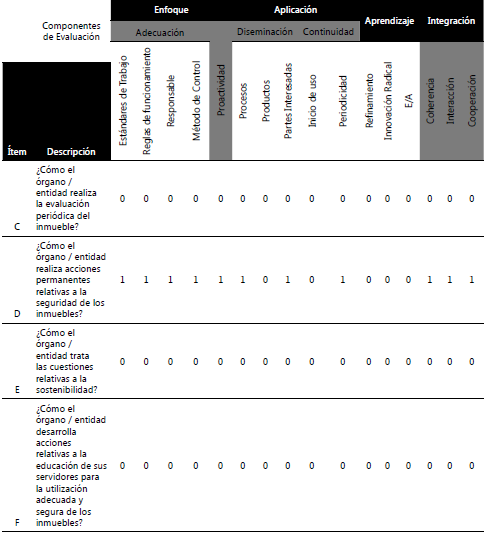 Ante la necesidad de comparación de realidades dentro de la administración pública de forma empírica y a partir del análisis documental de los modelos de excelencia en gestión brasileño y argentino, se presentan en las Tablas 4y5, los resultados de la aplicación del método demostrado en la Tabla 3. Para la evaluación de los ítems, se utilizaron los criterios definidos en el modelo Gespública (2014) relativos a los ítems gerenciales: enfoque, que busca evaluar el grado en que las prácticas de gestión de la organización presentan en cuanto a la adecuación y proactividad; aplicación, que se refiere al grado en que las prácticas de gestión de la organización presentan diseminación y continuidad; aprendizaje, que evalúa el grado en que las prácticas de gestión de la organización presentan mejoras derivadas del proceso de mejoras, y, finalmente, integración, que busca evaluar el grado en que las prácticas de gestión de la organización presentan coherencia, interrelación y cooperación.