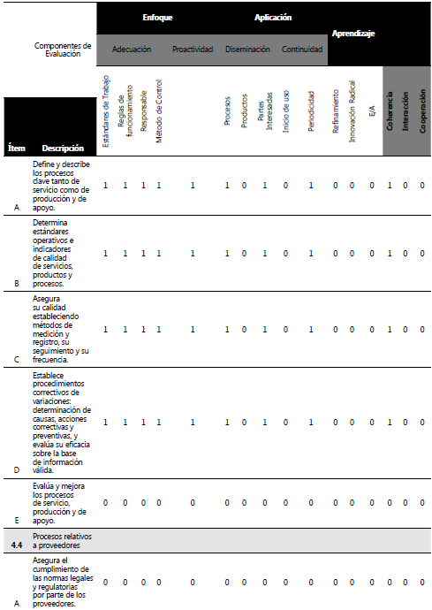 En la organización argentina, bajo la misma perspectiva de análisis comparada, el ítem 4.1 obtuvo el 60% de Adecuación y 100% de proactividad, asegurando el 60% para el factor enfoque. también alcanzó el 100% del factor aplicación, el 60% de refinamiento y el 100% de integración. Por lo tanto, ese ítem alcanzó el 70% de 20 puntos posibles, es decir, el 60% por haber sido el porcentaje más bajo entre los factores, más el 10%, como bono por haber obtenido porcentual superior en al menos otros dos factores. Por la misma lógica, según la Tabla 7, los ítems 4.2, 4.3 y 4.4 alcanzaron respectivamente, 10%, 10% y 0%. La puntuación total obtenida del criterio de pocesos fue de 20 puntos, alcanzando la conformidad del 22,22%.