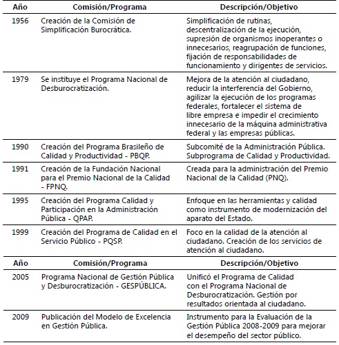 Bajo el enfoque del gerencialismo y la desburocratización, la evolución histórica de estas iniciativas en Brasil condujo a la generación del Programa Nacional de Gestión Pública y Desburocratización (Gespública), creado a través del Decreto 5.378 del 23 de febrero de 2005. Dicho programa busca, por medio de la aplicación del modelo de excelencia en gestión pública, integrar las diversas perspectivas de la gestión con foco en procesos, resultados y en la calidad de la prestación de los servicios públicos. Además, se observa que la Fundación Nacional de la Calidad (FNQ), creada en 1991, desarrolla el Modelo de Excelencia en Gestión (MEG) con el propósito de contribuir a la mejora de la gestión de las organizaciones brasileñas de diversos sectores (FNQ, 2013).