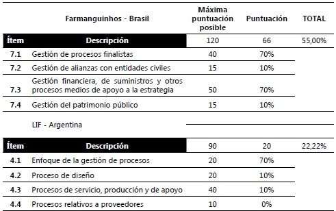 En la organización brasileña, para cada conjunto de requisitos, se analizaron todos los subfactores. El ítem 7.1 obtuvo 80% de Adecuación y 100% de Proactividad, asegurando el 80% para el factor enfoque. Adicionalmente, se alcanzó el 100% del factor aplicación, el 60% de refinamiento y el 100% de integración. Siendo así, ese ítem alcanzó el 70% de 40 puntos posibles, o sea, el 60% por haber sido el porcentaje más bajo entre los factores, más el 10%, como bono por haber obtenido porcentual superior en por lo menos otros dos factores. Por la misma lógica, según la Tabla 6, los ítems 7.2, 7.3 y 7.4 alcanzaron respectivamente el 10%, el 70% y el 10%. La puntuación total del criterio de procesos obtenida por Farmanguinhos fue 66 puntos, alcanzando la conformidad del 55%.