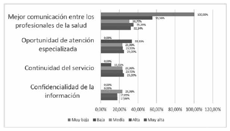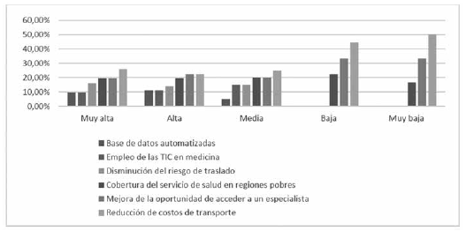 En cuanto a los avances de la telemedicina en Colombia, los resultados de la Gráfica 2 muestran que se vienen alcanzando avances telemédicos importantes al disminuir riesgos, ampliar cobertura, reducir costos y emplear bases de datos o mejorar oportunidades. Los avances en esta materia se revierten en mayores innovaciones para el país, esto es lo que ha demostrado la literatura, las encuestas y las entrevistas a nivel mundial (Alaboudi, Atkins, Sharp, Balkhair, Alzahrain, & Sunbul, 2016).