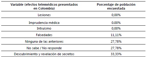 Dentro de los efectos penales telemédicos, los profesionales de la salud que formaron parte de la muestra han enfrentado la revelación de secretos (4%) y la muerte del paciente (4%). El porcentaje restante (92%) señala no haber afrontado ninguno de los efectos sugeridos en la encuesta, la cual incluía también la expulsión de fetos y la ocasión de lesiones.