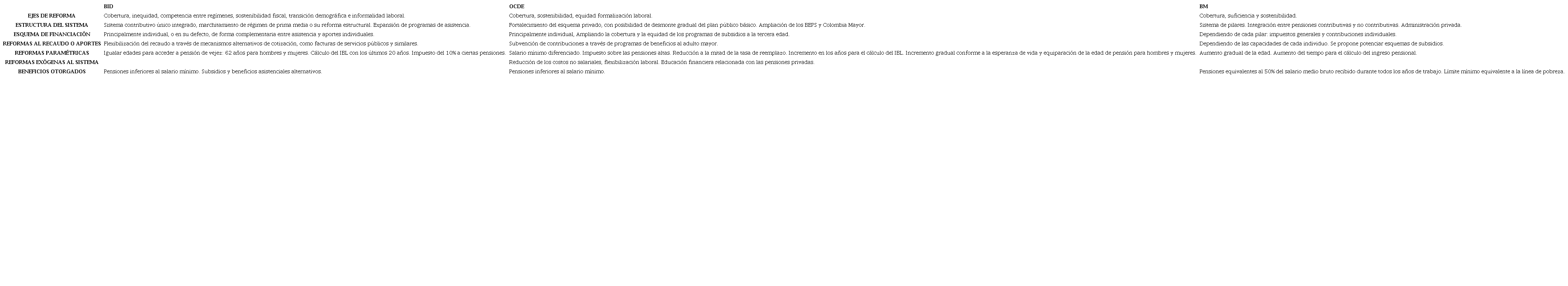 A continuación, se expondrán las perspectivas de reforma pensional en Colombia propuestas por tres de los principales organismos económicos multilaterales que se han pronunciado sobre la materia: el BID, la OCDE y el Banco Mundial.