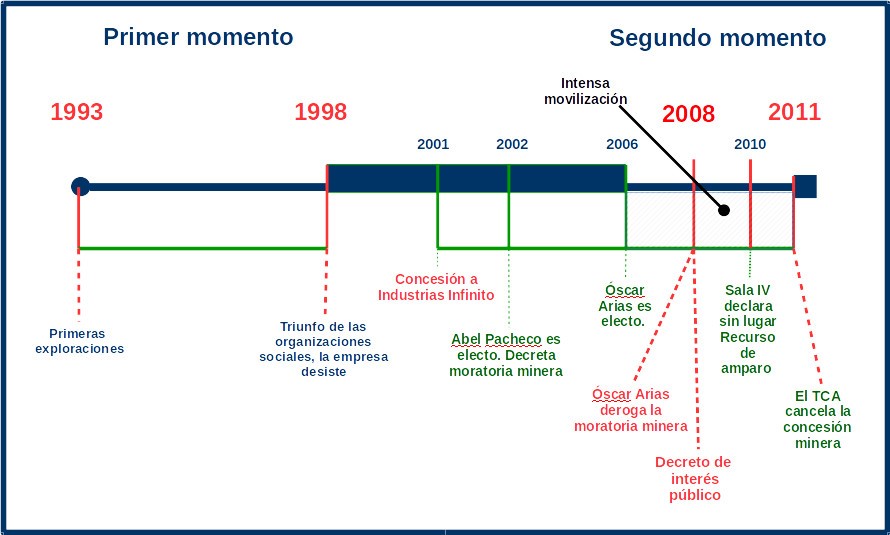 1993: primeras exploraciones de algunos geólogos en la zona. 1994-1995: primeras acciones de información; en 1994 se presenta una queja en la Defensoría de los Habitantes porque los permisos en las áreas de exploración ya contaban con legítimos propietarios y por temor a posibles daños ambientales. En 1995 se organizaba la oposición con la asesoría de AECO. 1996: el debate se nacionaliza, académicos, políticos y religiosos debaten sobre conveniencia de la actividad minera. Se crea el Frente Nacional de Oposición a la Minería a Cielo Abierto. 1996-1997: en estos dos años el debate se intensifica, así como la organización y acciones locales. En 1997 se publica la fusión de varias empresas, con lo que abarca un total de 33 concesiones con un total de 607 km2. 1998: Placer Dome abandona el país. Otras empresas intentan darle continuidad al proyecto.