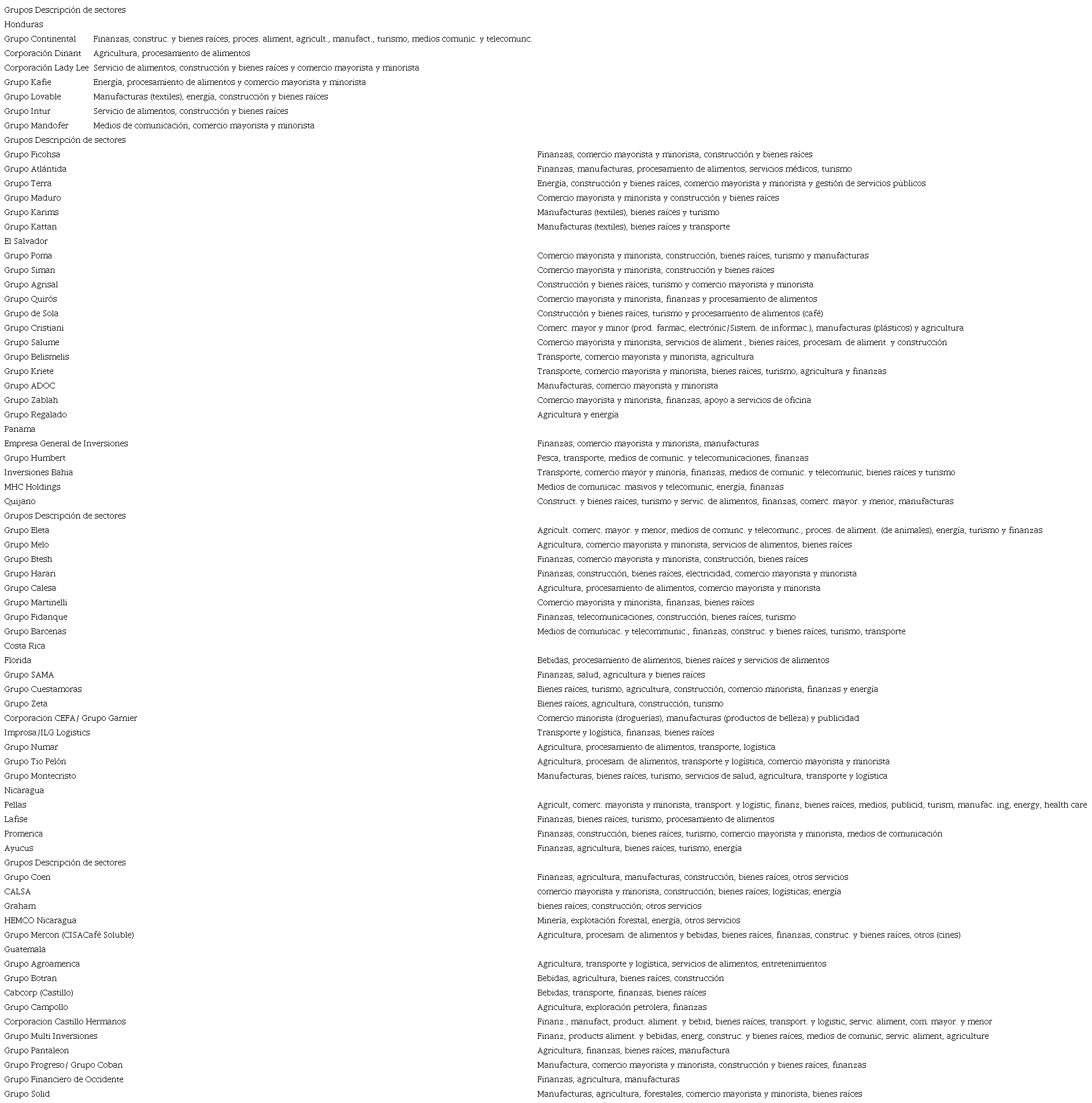 En primer lugar, los grupos empresariales diversificados concentran su control en los recursos económicos y en diferentes sectores y esferas. Se definen regularmente como “empresas legalmente independientes que operan en múltiples industrias (a veces no relacionadas), que están unidas por persistentes lazos formales (por ejemplo, de capital) e informales (por ejemplo, familiares)” (Khanna y Yafeh, 2007, 331). Estos lazos pueden incluir accionado mutuo, estrechos vínculos en el mercado (como las transacciones entre empresas) o relaciones sociales a través de los cuales se coordina para lograr objetivos recíprocos. En América Central, los grupos claramente dominantes están unidos por lazos familiares. Además, con frecuencia, la única forma de identificar un grupo es la de comenzar por la familia o la red familiar, pues muchos no tienen un nombre en común y son en realidad compañías individuales.