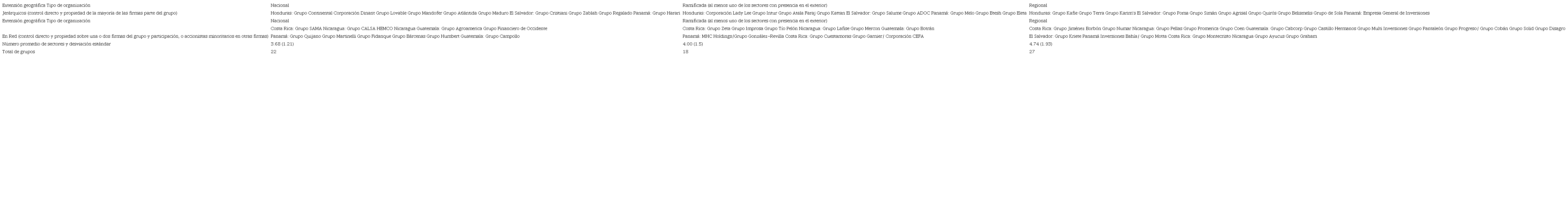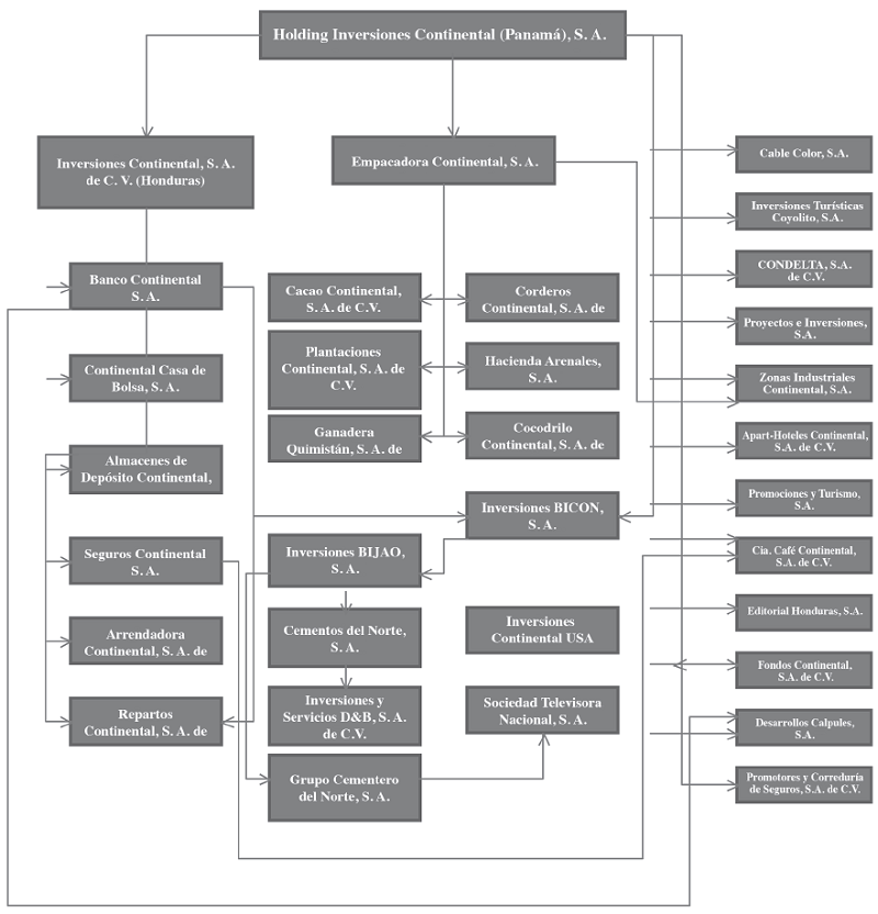 Los grupos difieren significativamente en su forma de integración. La Figura 1 muestra un ejemplo de grupo, el Grupo Continental, propiedad de la familia hondureña Rosenthal, registrado en Panamá, antes de que se desolviera después del arresto de sus dueños en el 2015 por lavado de dinero en los Estados Unidos. La Figura 1 muestra cómo la sociedad incluyó una serie de empresas legalmente independientes, muchas de las cuales tienen accionistas recíprocos.