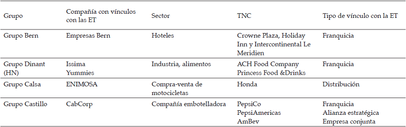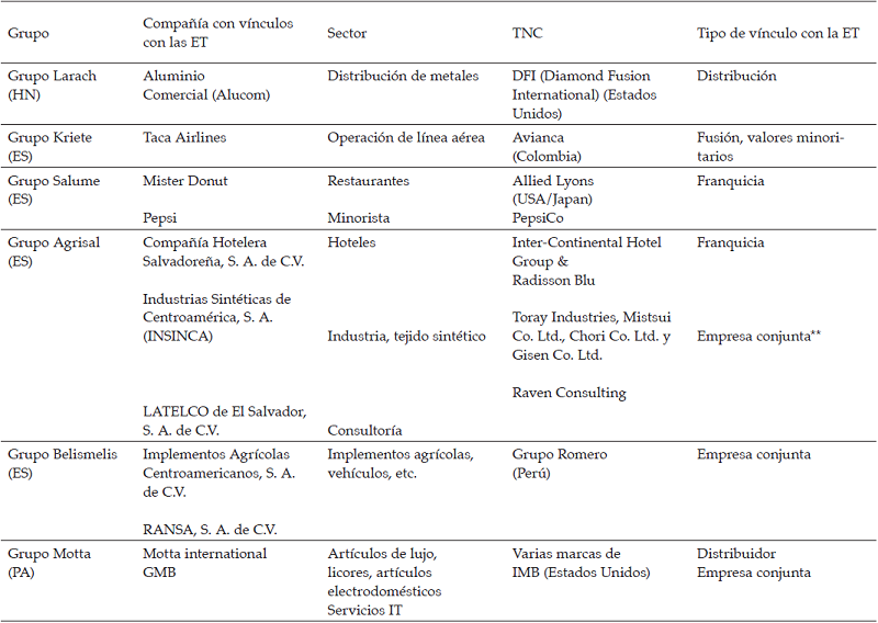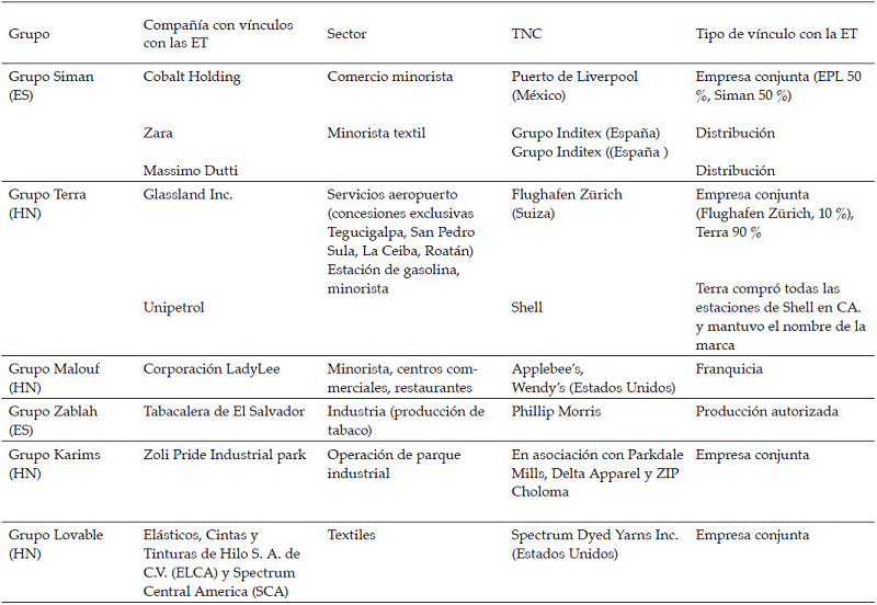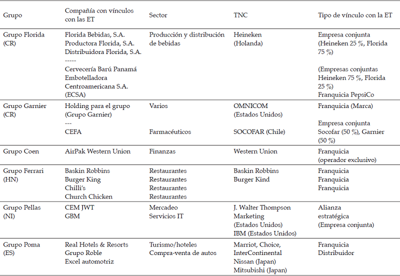 Si se analizan las asociaciones que aparecen en la Tabla 4 se encontrarán 10 empresas conjuntas y solo una alianza estratégica; 7 grupos son distribuidores exclusivos de marcas internacionales en la región o el país, mientras que las franquicias se convierten en la forma más común de relacionarse. En algunos casos, estas equivalen a estar subordinadas a los intereses del capital trasnacional, como, por ejemplo, una serie de grupos hondureños que se especializan en operar franquicias para las cadenas de comida rápida de los EE. UU. Sin embargo, muchos de estos tienen relaciones con diferentes ET o pueden cambiar de ET con el tiempo, mientras que sus negocios continúan. Además, ciertos grupos (Poma de El Salvador) tienen un mayor grado de control en sus operaciones hoteleras y, de hecho, ha cambiado en varias ocasiones las marcas con las cuales trabajan.