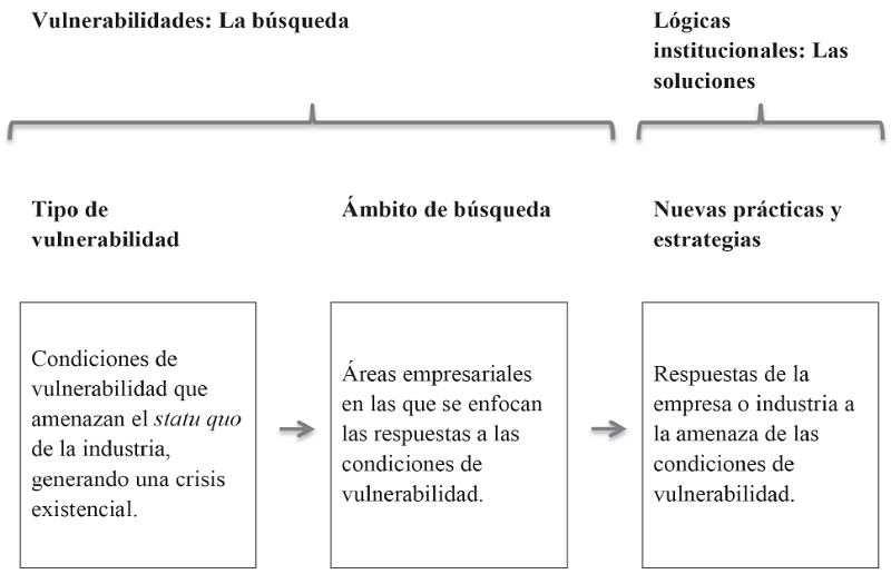 El primer esquema analiza los distintos tipos de vulnerabilidades que pueden afectar a una empresa o industria y explora cómo su presencia motiva la búsqueda de nuevas prácticas y estrategias empresariales. El segundo esquema desvela las lógicas institucionales que inspiran a los líderes empresariales, las cuales funcionan como guías en la selección de nuevas prácticas y estrategias, cuando enfrentan condiciones de vulnerabilidad (Figura 1).