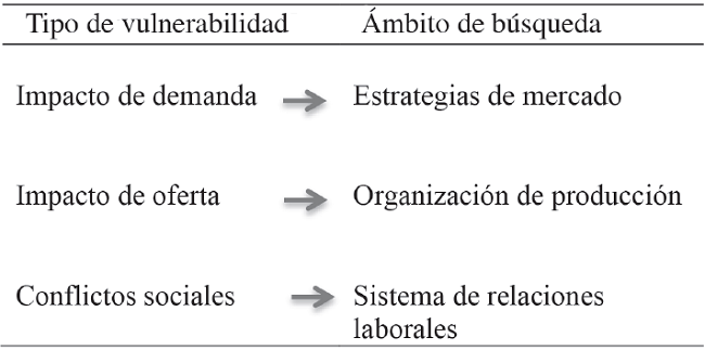 Es decir, cada tipo de vulnerabilidad enfoca los esfuerzos empresariales en un ámbito diferente: un shock de demanda probablemente suscitará una búsqueda de nuevas estrategias de mercado, la cual involucre cambios en los productos y grupos de consumidores; un shock de oferta puede enfocar la atención empresarial en la organización de la producción, donde se incluya el manejo de la cadena de suministros y la selección de tecnología y capital de trabajo; y los conflictos sociales tenderán a promover la revisión del sistema de relaciones laborales. Así pues, el esquema provee la posibilidad de predecir, hasta cierto punto, el tipo de acción empresarial que un repentino cambio contextual desencadenará (Figura 2).