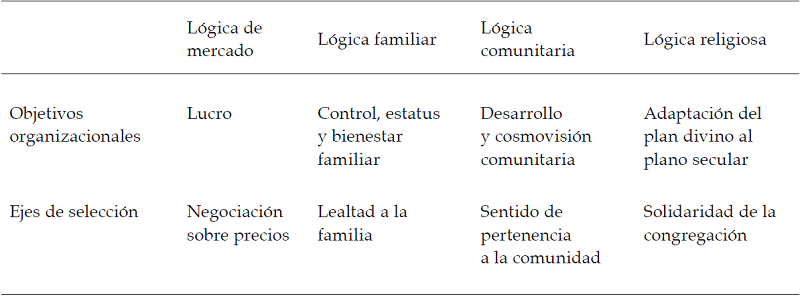 Así pues, mientras que los criterios de las lógicas de mercado, familiar, profesional y comunitaria (descritas anteriormente) son la negociación de precios, la lealtad a la familia, las relaciones profesionales y el sentido de pertenencia a la comunidad, respectivamente; en el caso de la lógica religiosa predomina la solidaridad de la congregación (Tabla 1). Cabe señalar que tanto el contenido concreto del plan divino de redención y salvación, como el significado de la solidaridad, membresía y jerarquía de la congregación se definirán de acuerdo con los preceptos específicos de la teología religiosa adoptada.