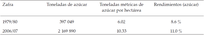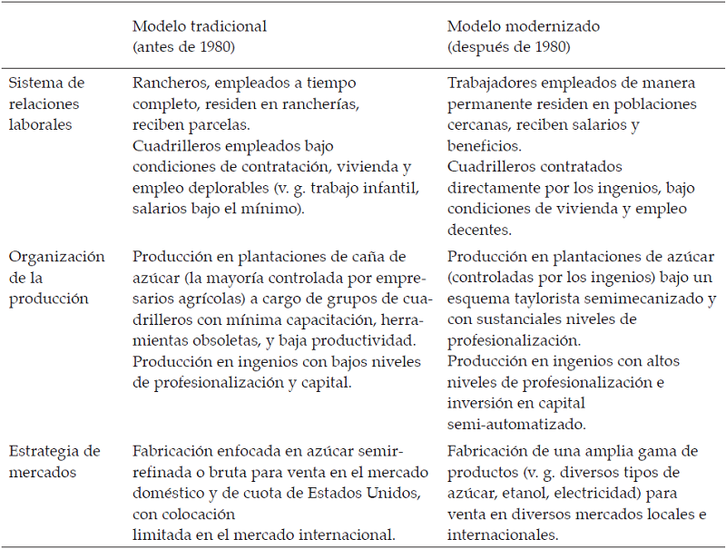 En términos de la organización de su producción, los ingenios han tomado el control de la mayor parte de las plantaciones de caña de azúcar, con lo cual imponen un esquema industrial de producción inspirado en el taylorismo. Los cuadrilleros cortan caña bajo la dirección minuciosa de un alto número de profesionales agrícolas. Además, reciben capacitación y herramientas de trabajo especializadas. Como resultado, cortan la caña de manera altamente eficiente y le han permitido a la industria incrementar su producción de manera exponencial (Tabla 3).
