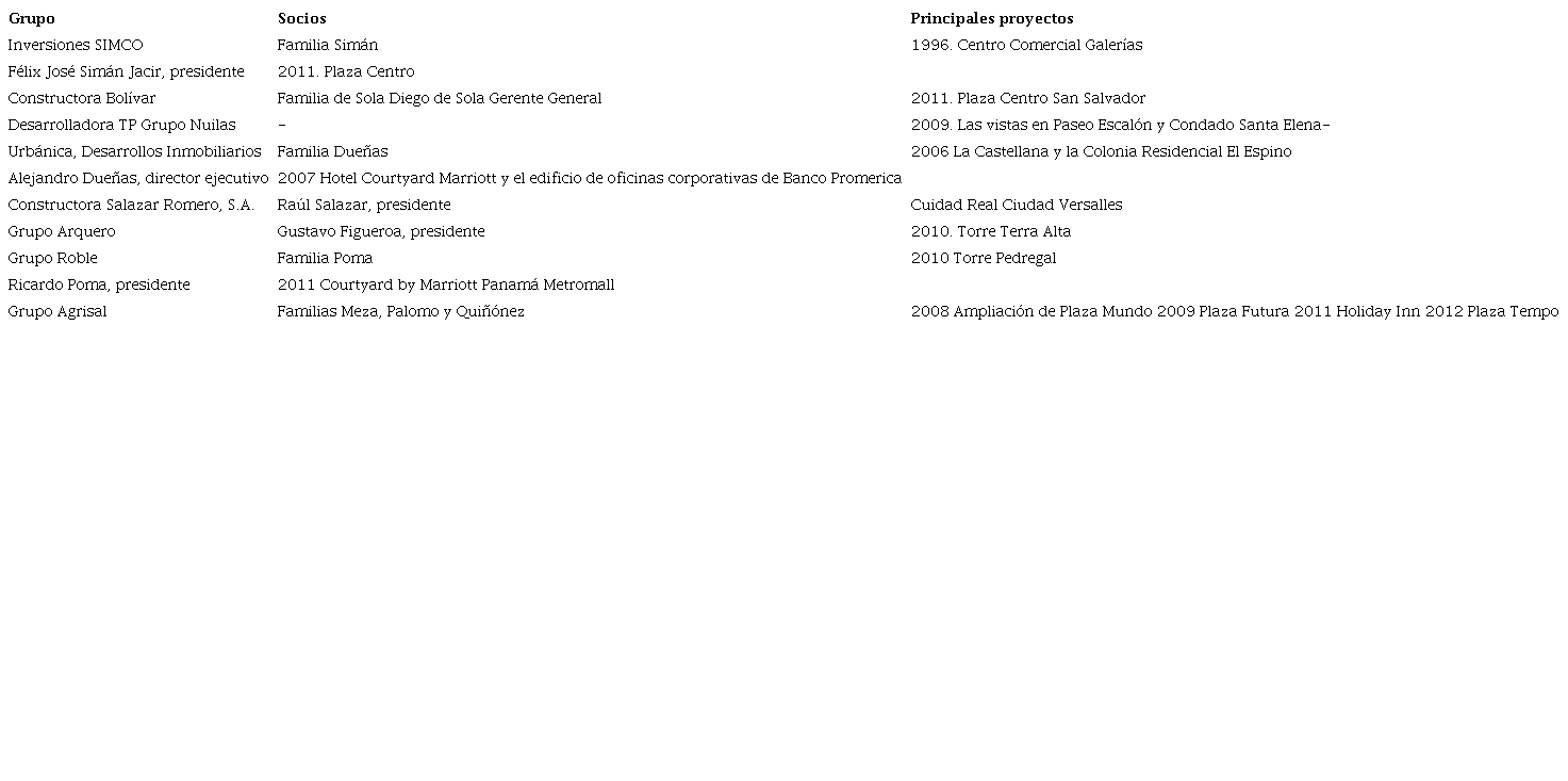 Desde el sector privado, según la Cámara Salvadoreña de la Industria de la Construcción (CASALCO), si bien se pueden identificar 447 empresas ligadas al sector construcción, también resulta fácilmente rastreable una concentración por grandes proyectos en solo ocho empresas (Tabla 2). De estas ocho empresas, tres (Inversiones SIMCO S.A, grupo Roble y Agrisal) han asumido a la región como su eje de acumulación con una nueva estrategia de desarrollo de centros integrados (hoteles, centros comerciales y centros corporativos). Es claro también que esta expansión ha sido clave en el establecimiento de redes interélites y con élites de otros países de la región, lo cual les ha abierto las puertas a zonas de alta plusvalía y desarrollo económico.