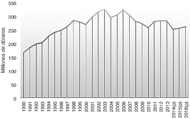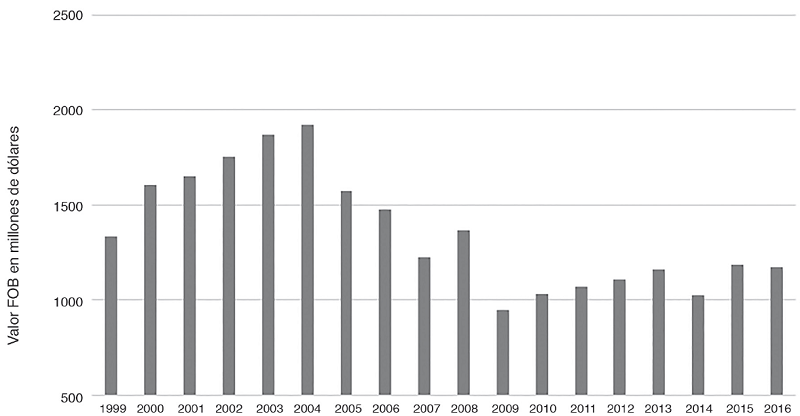 En este caso, si bien la maquila es y sigue constituyendo una fuente de acumulación para algunas élites salvadoreñas, la vulnerabilidad del mercado, la crisis económica de 2008, la competencia internacional con China, Vietnam, Paquistán, entre otros países, y la dignificación de algunos derechos laborales y salarios principalmente, hacen de este un sector menos “rentable” para las élites. Como se puede ver en la Figura 1, si bien la maquila manifestó un crecimiento importante desde la década del noventa hasta el año 2004, alcanzando los casi dos mil millones de dólares en exportaciones, desde el año 2005 y de la mano de los factores señalados el sector maquilero sigue sin poder recuperarse.