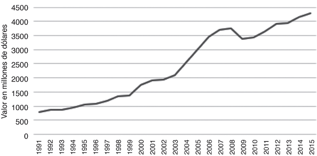 A diferencia de lo sucedido con la maquila y las finanzas, el eje de acumulación de la “exportación de gentes e importación de remesas” ha estado creciendo. Las remesas más allá de la discusión social que pueda implicar han favorecido la liquidez de la economía salvadoreña y los ingresos. Estos flujos de dólares se han mantenido crecientes en las últimas décadas pasando de representar 790 millones de dólares en 1991 a 4 279 millones en 2015 (Figura 2).