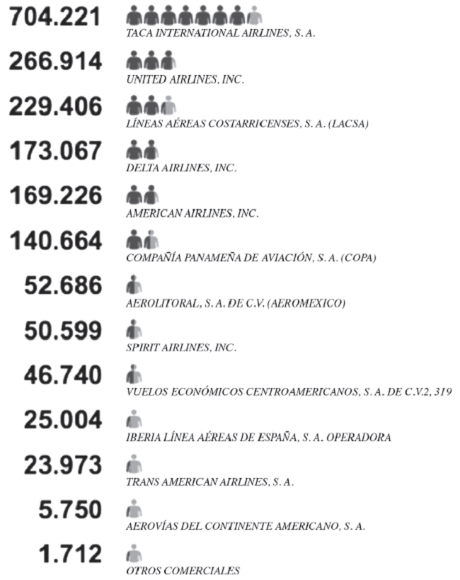 Este crecimiento de Taca, como señala Rocha, debe su éxito al efecto de flujo migratorio centroamericano hacia los EE. UU. y Canadá. Como se puede ver en la Figura 3, cuando las personas viajan a El Salvador una mayoría de personas (38 %) lo hace a través de TACA; empresa que creó el programa VFR (Visit Friends and Relatives) con el objetivo de acaparar el mercado de “los que regresan” y “el hermano lejano”.