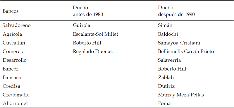 En los años noventa, y de la mano de una coyuntura global de amplia especulación y financiarización de las economías, la apuesta del binomio gobierno-élites se centró en la captura del sector bancario salvadoreño. Así, con el auspicio del gobierno de Alfredo Cristiani, prominente miembro de la élite tradicional modernizada, se aprobó la Ley de Privatización de los Bancos Comerciales y de las Asociaciones de Ahorro y Préstamo. Para esta venta, el Estado salvadoreño saneó/recapitalizó las carteras de varias asociaciones de ahorro y préstamo y de los cinco bancos comerciales nacionalizados en la década de los ochenta. La venta si bien buscó la “no” concentración de capital, al prohibir el control de más de un 5 por ciento de las acciones, los fenómenos del “testaferrismo” consolidaron la emergencia de una nueva élite financiera salvadoreña (Segovia, 2002) (Tabla 1).