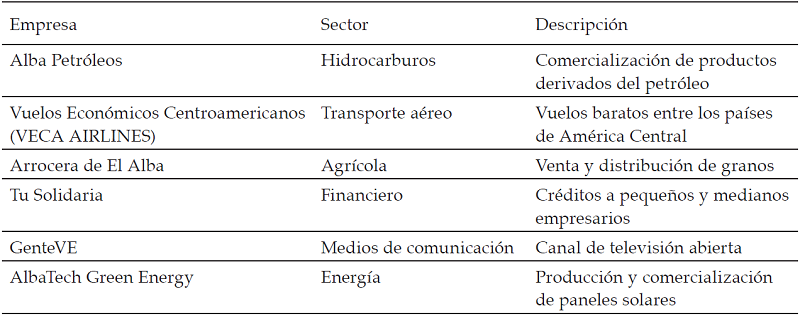 Además, y más importante aún para entender las relaciones con las élites económicas ha sido el impulso dado a las empresas del asocio salvadoreño venezolano: ALBA petróleos. Nacida como una empresa de economía mixta en el año 2006 en el marco del acuerdo de PetroCaribe con Venezuela, Alba petróleos conforma la Asociación intermunicipal Energía para El Salvador (ENEPASA). En alguna medida, Alba petróleos se ha constituido en lo que en su momento fue el sector financiero para las élites salvadoreñas a mediados de los años noventa, al proveer de dinero fresco a un nuevo núcleo empresarial que ha buscado acceder a mercados hasta ahora acaparados por pocos grupos empresariales: medios de comunicación, transporte aéreo, finanzas, energía e hidrocarburos. La mayoría de estas empresas se ha abierto a través de préstamos y subsidios destinados a un pequeño núcleo de personas, políticos del FMLN en su mayoría (Tabla 3).