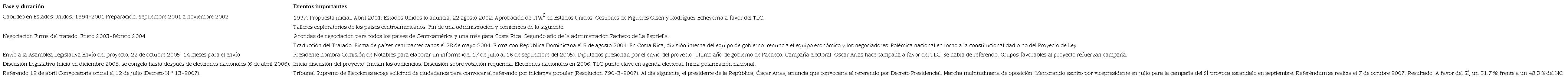 Se considera que la negociación de este acuerdo fue muy rápida, puesto que se llevó a cabo en 14 meses, en tanto que el envío del proyecto al Parlamento tomó 17 meses. Si bien el expresidente Abel Pacheco impulsó el proyecto a inicios de su administración, y lo hizo con toda la energía de un gobierno entrante, a mitad de su periodo estaba dispuesto a desistir de este, debido a la fuerte oposición social que generó. La Tabla 1 expone un resumen de las etapas por las que pasó la tramitación del TLC. Durante el lapso 1961-1991, el único tratado comercial preferencial firmado por Costa Rica fue el que dio origen al Mercado Común Centroamericano. Luego, entre 1994 y 2007, se firmaron nueve tratados comerciales (Alonso, 2009, 3).