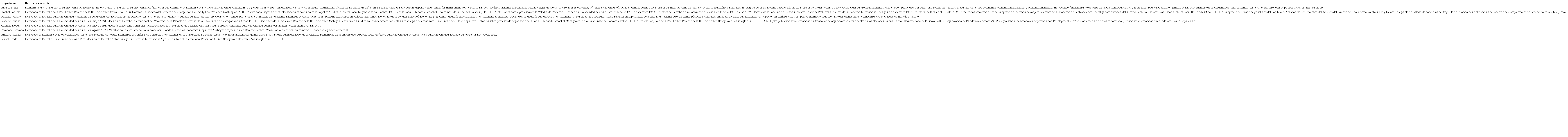 La Tabla 2 muestra que los negociadores principales conforman un grupo que ha invertido tiempo y recursos en su formación, con lo cual, esta inversión se transforma en un capital profesional.3 La hoja de vida del exministro de Comercio Exterior, por ejemplo, dice lo siguiente: “Alberto Trejos obtuvo con honores el Ph.D. en Economía de la Universidad de Pennsylvania”. Asimismo, en el caso de Federico Valerio, jefe de la mesa de negociación sobre servicios e inversión, se indica que cuenta con un título de doctorado y dos maestrías (una en Derecho Internacional y otra en Integración Económica), lo cual lo convierte en el más calificado de ese grupo.