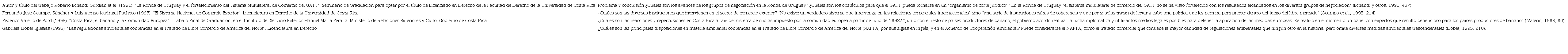 Ahora bien, los temas de los trabajos de graduación (licenciatura) de los negociadores versan sobre los siguientes asuntos: el sistema multilateral de comercio, el sistema estatal de comercio exterior costarricense, la disputa con la Unión Europea por el comercio del banano y las regulaciones ambientales dentro de los tratados comerciales.