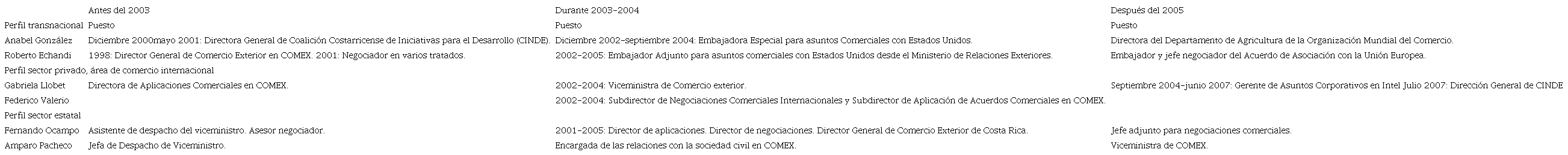 Todos ellos realizaron sus estudios de bachillerato y licenciatura en Costa Rica,4 pero llevaron a cabo estudios de posgrado fuera del país, principalmente, en Inglaterra y en Estados Unidos. En general, las especializaciones se centran en áreas de la política económica, negociación y derecho internacional. Lo anterior tiene como espacio de intersección el comercio exterior.