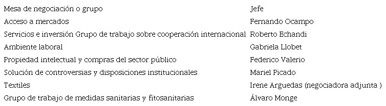 La estructura de la negociación se hizo de acuerdo con los temas establecidos por la OMC y se crearon cinco mesas y dos grupos de trabajo.