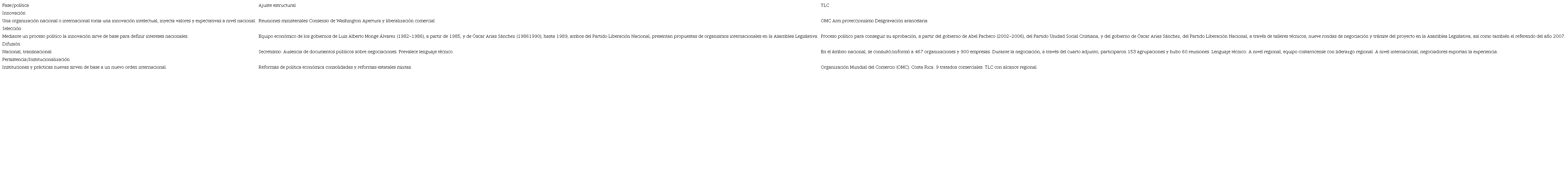 Para ilustrar algunos de los aspectos que hacen del equipo negociador parte de una comunidad epistémica inédita, en la Tabla 8 se comparan las fases de la gestión de dicho acuerdo y el caso del equipo económico que negoció el ajuste estructural en Costa Rica.