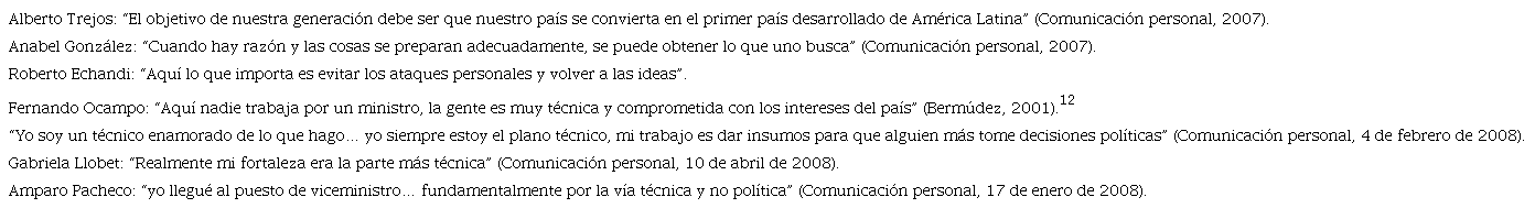 En las afirmaciones de esos cuatro negociadores se nota que mantenerse en el plano técnico es parte del profesionalismo al cual aspiran y que ellos comparten la creencia en la separación del ámbito técnico y político. Además, se autoperciben como “gente de ideas”.