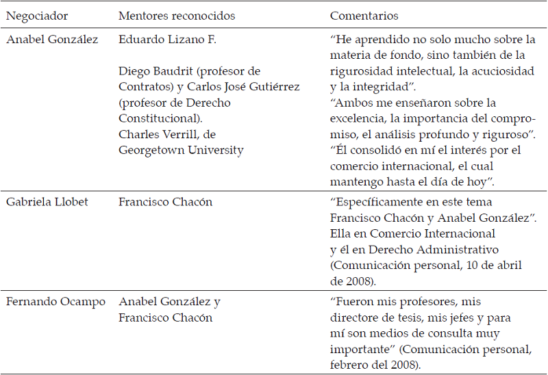 Para complementar esta visión sobre instituciones, espacios y personas de referencia en la socialización de los negociadores, se presenta a continuación a las personas que algunos de ellos reconocieron como sus mentores.