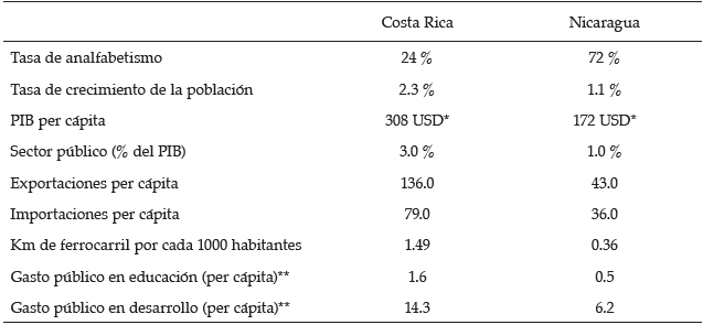 Héctor Pérez Brignoli ofrece cifras que permiten, en general, comparar el nivel de desarrollo del Estado en los países centroamericanos a mediados de la década de 1920 y, en especial, contrastar Nicaragua con Costa Rica (Pérez Brignoli 114). El autor parte de la siguiente constatación: más del 50 por ciento de los ingresos de los Estados centroamericanos procedían de los derechos aduaneros y, como las élites invertían muy poco, el gasto público era la principal fuente de inversión para el desarrollo futuro. Ahora bien, a fines de los años 1920, los patrones de gasto público de Costa Rica, ya señalados, se tradujeron en un PIB per cápita mayor al de los otros países del istmo, el cual apenas representaba una cifra de entre el 80 y 60 por ciento del PIB de Costa Rica. Dicho país también mostraba cifras superiores en comercio exterior y gasto público y en indicadores económico-sociales, como tasa de alfabetización, tasa de crecimiento de la población y esperanza de vida. Así, la diferencia de Costa Rica, en relación con los otros países centroamericanos, era consecuencia de la naturaleza y las políticas de su Estado.