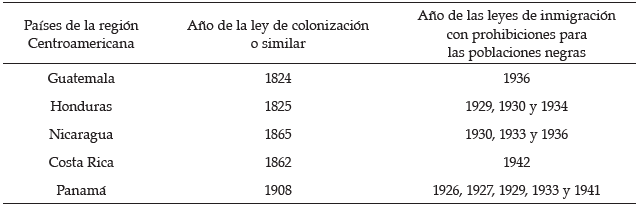 Es por ello que, en medio de dicha construcción nacional, se inauguran leyes de colonización o similares en los años de: 1824 en Guatemala, 1825 en Honduras, 1862 en Costa Rica, 1865 en Nicaragua y 1908 en Panamá. A la vez, se inscriben una serie de prohibiciones migratorias, así como restricciones legales en cada país de la región centroamericana, hechas a la medida de las poblaciones negro-extranjeras y con sus puntos álgidos en: 1936 para el caso de Guatemala; 1929, 1930 y 1934 para el caso de Honduras; 1930, 1933 y 1936 para el caso de Nicaragua; 1942 para el caso de Costa Rica; y 1926, 1927, 1929, 1933 y 1941 para el caso de Panamá. Lo anterior puede visualizarse mejor en la Tabla 1.