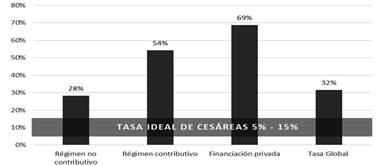 En conclusión, para todos los regímenes de financiación las tasas de cesáreas son muy superiores al límite superior de la tasa ideal. Este comportamiento de la tasa de cesáreas, el cual es estructural para todo el sistema de salud, cuestiona la calidad de los cuidados al parto recibidos por las mujeres (Caño 3) e incrementa los riesgos para la salud de las mujeres y las criaturas recién nacidas: para las mujeres, la cesárea incrementa el riesgo de mortalidad materna en más del doble, además de incrementar el riesgo de sufrir complicaciones diversas, entre ellas la infección puerperal, hemorragia, tromboembolismo, lesión de órganos próximos (como la vejiga o los intestinos), histerectomía, síndrome postraumático y depresión postparto, además de generar repercusiones negativas a largo plazo en los futuros embarazos, como un mayor riesgo de acretismo, rotura uterina, placenta previa o embarazos ectópicos (Villaverde 29; Lumbiganon 496; Coalition for Improving Maternity Services 1-3).