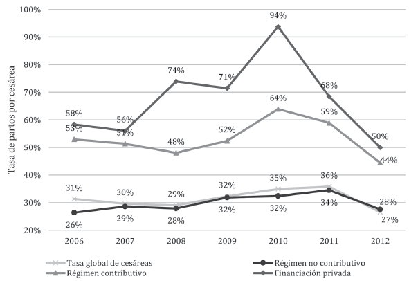 Al analizar la evolución de la tasa en el periodo 2006-2012, se puede observar que la sobretasa de cesáreas es estructural para el sistema de salud (Figura 2). Para el régimen contributivo y el sistema de financiación privada, se observa una reducción importante en la tasa a partir del 2010, la cual podría estar relacionada con los cambios normativos introducidos a partir del 2008, especialmente con la introducción de la Norma 042 para la Humanización del Parto Institucional (Ministerio de Salud de Nicaragua).