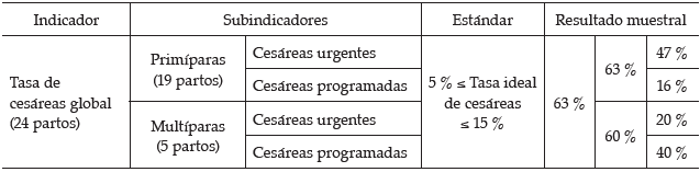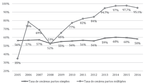 Como se ha apuntado anteriormente, a nivel poblacional los mejores resultados, en términos de mortalidad y morbilidad materna y neonatal, se observan cuando la tasa de cesáreas oscila entre el 5 por ciento y el 15 por ciento. Cuando los partos por cesárea son superiores al 15 por ciento o inferiores al 5 por ciento, es indicativo de que en el sector salud existen factores (relacionados con la práctica clínica o no) que están impactando negativamente sobre la calidad de los cuidados a la salud durante el parto y sobre los resultados en términos de salud materna y neonatal (Villaverde 31).
