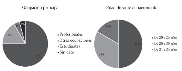 En relación a su caracterización socioeconómica, dieciocho de las participantes eran profesionales, tres ejercían actividades no cualificadas, 1 era estudiante y una mujer no ofreció este dato. Veinte mujeres contaban con una edad comprendida entre 20 y 30 años en el momento del nacimiento del bebé y cuatro presentaban entre 31 y 35 años. El 79 por ciento (19 mujeres) no habían parido ni se había sometido a una cesárea con anterioridad.