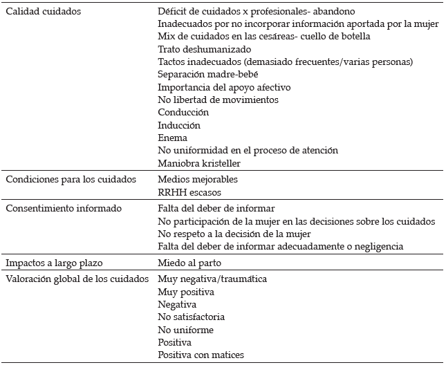 Los datos recogidos en relación a la vivencia del parto fueron analizados aplicando la técnica del análisis del contenido, identificando 5 categorías y 27 temas relacionados con la calidad de los cuidados al parto (Tabla 1). El análisis de los resultados se realizó clasificando la información en dos secciones: