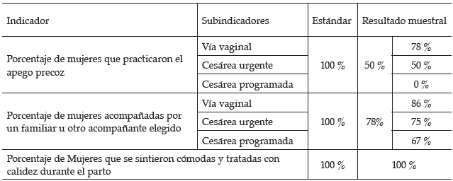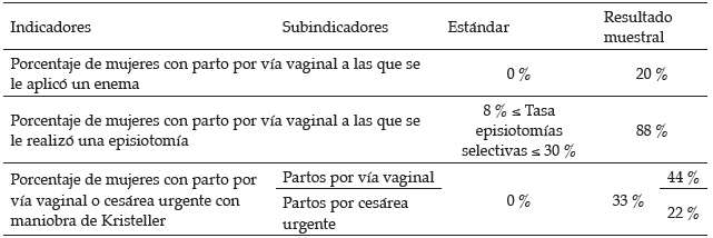 El análisis de la aplicación de las recomendaciones de la OMS para los cuidados al parto se realizó comparando los cuidados recibidos por las participantes en el estudio contra una selección de cuidados orientados por la OMS. Este análisis se realizó a través de 11 indicadores construidos al efecto, comparando el valor observado en la muestra contra el estándar recomendado. Los indicadores seleccionados para efectuar este análisis comparativo fueron los siguientes: