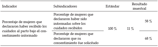 Los datos indican que solo un 11 por ciento de las mujeres de la muestra declararon que los cuidados y procedimientos médicos realizados fueron aplicados tras cumplir ambos requisitos (Tabla 6). Como se observa en la Tabla 6, el 58 por ciento de las mujeres indicó que se le informó sobre los cuidados y procedimientos médicos indicados, y el 68 por ciento expresó que el personal de salud solicitó su consentimiento, pero solo el 11 por ciento declaró que se habían producido ambas circunstancias al mismo tiempo, condición necesaria para entender la realización efectiva del consentimiento informado.