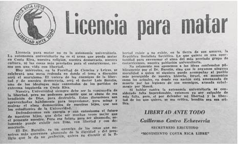 Ese mismo miércoles 31 de mayo de 1967, quizás en la mañana temprano, don Teodoro Olarte puede haberse llevado una sorpresa, en modo alguno sospechada, cuando leyó un campo pagado en el diario La Nación, titulado “Licencia para matar” (Figura 1), firmado por el Secretario Ejecutivo del Movimiento Costa Rica Libre, Guillermo Castro Echeverría.