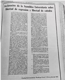 Por esto, ante la circunstancia concreta de una cátedra que trabaja dentro del más estricto sentido académico del término, y ante las gratuitas acusaciones y ataques producidos, creímos necesario y urgente que fuera convocada la Asamblea Universitaria para que “discuta y respalde la intervención del Consejo Universitario en defensa de la libertad de cátedra y la autonomía universitaria”, y para que formule, así, su sentimiento de defensa de la libertad de expresión, amenazada por aquellos grupos operantes en nuestro país, que favorecen la exclusión del diálogo de nuestra vida política y cultural para sustituirlo por la presencia del comité de censura y fatalmente, por el gendarme.