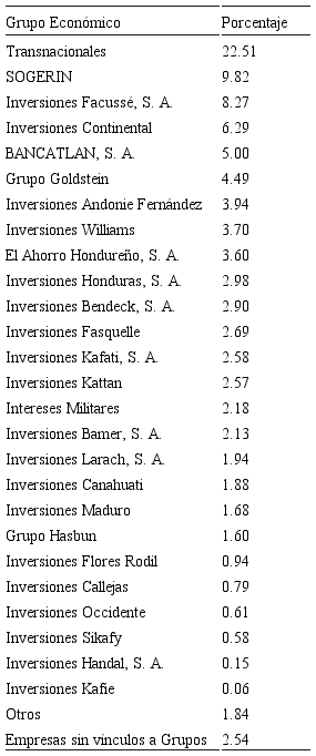 Este capital financiero a su vez se distribuía en 26 grandes grupos económicos organizados en más de 2000 empresas. En su conjunto, 25 de estos grupos económicos constituía la “burguesía nacional”, eje fundamental y mayoritario del total del capital financiero, puesto que solamente los primeros tres grupos (SOGERIN, Inversiones Facusse, S.A. e Inversiones Continental) representan más capital que aquel registrado por las empresas transnacionales (Tabla 1). Igualmente, señala Flores, un subgrupo de empresas, incluyendo esta vez al grupo transnacional, formaban una “oligarquía financiera” dentro del capital financiero en sí.