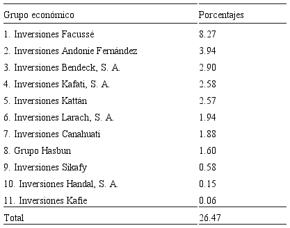 En relación con los árabe-hondureños, el Tabla 2 presenta los once grupos económicos que fácilmente pueden identificarse como familias cuyas generaciones no se remontan más allá de las primeras décadas del siglo XX, es decir, aquellos con apellidos Facusse, Andonie, Bendeck, Kafati, Catan, Larach, Canahuati, Hasbun y Sikafie.