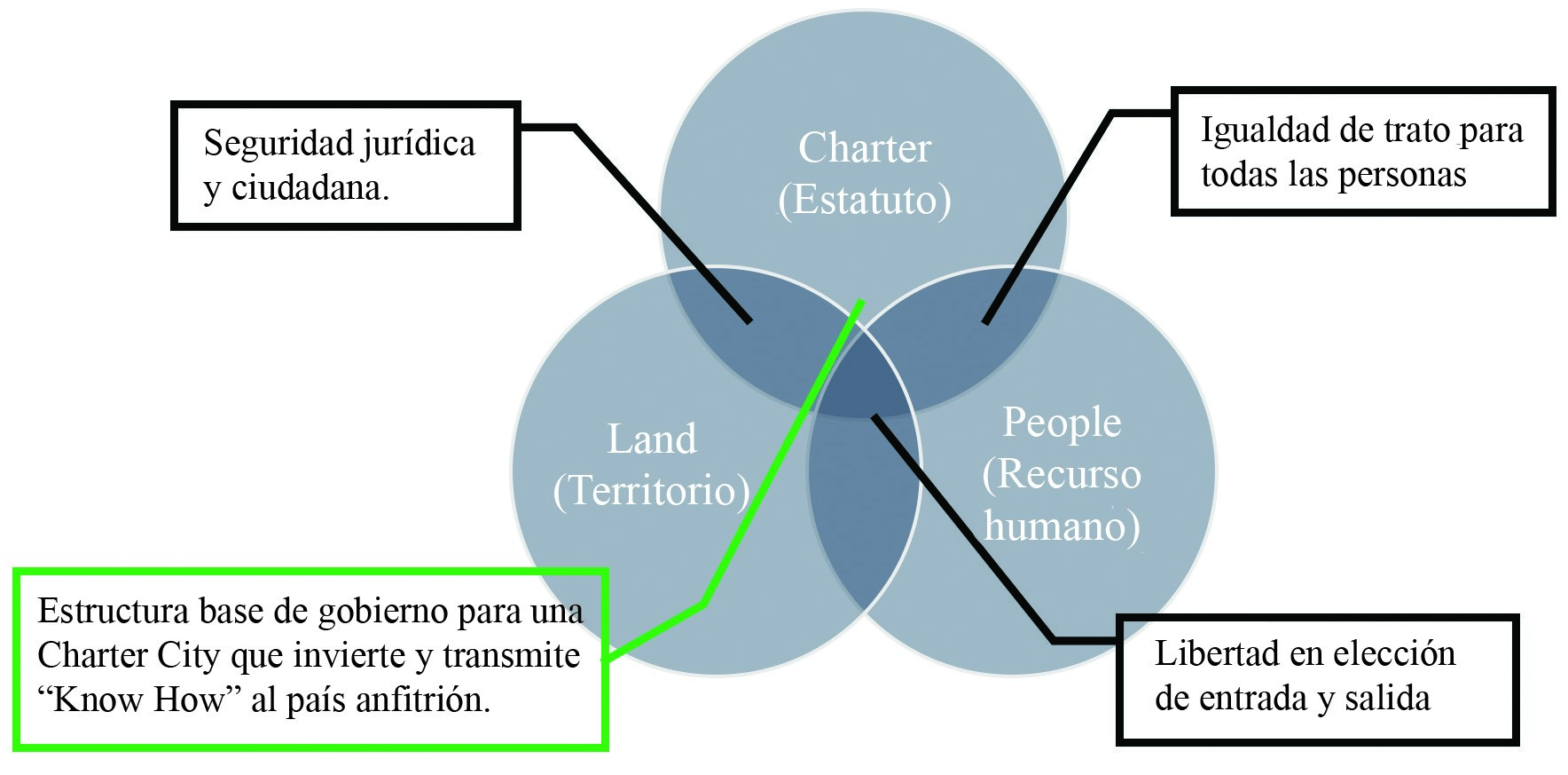 Al analizar la relación sobre cómo se complementan los roles de los países y los elementos básicos del modelo de una ciudad chárter (Figura 8), se puede ver que el papel más importante lo ejecuta el país socio, ya que es el responsable del “estatuto” o de las reglas a seguir en la ciudad chárter, el cual es la herramienta principal para asegurar el trato igualitario del recurso humano está a cargo del país origen. Con la aplicación del estatuto para administrar el territorio se genera un elemento más en el modelo, y este es la “seguridad”, que va desde la jurídica hasta la ciudadana, la cual es crucial para invertir en cualquier lugar del mundo. A la vez, el recurso humano del país origen es atraído por un territorio donde existe “libertad” para elegir invertir recursos económicos, labor humana y/o conocimiento profesional. Mediante el esquema, se puede visualizar que acoplarse todos los roles y elementos forman lo que se conoce como “Estructura base del gobierno de una Charter City”.